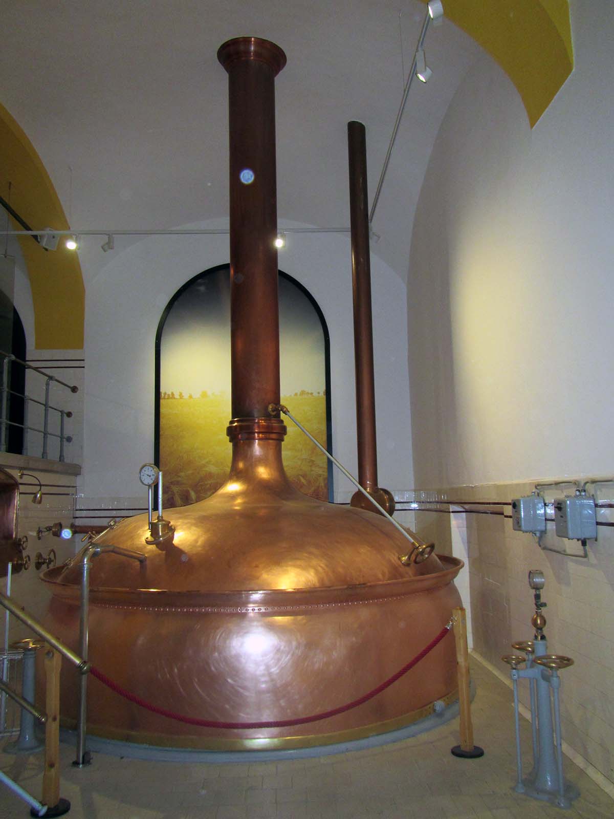 Fortgesetzt wird der Rundgang im Sudhaus, wo es die großen Kupferkessel zu bestaunen gibt, in denen der Sud unter der strengen Kontrolle des Braumeisters gekocht wird.
